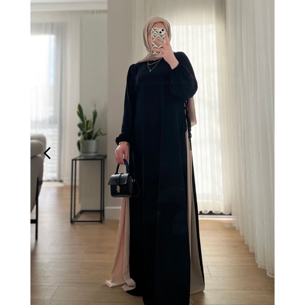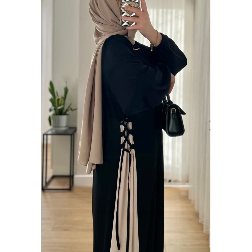 • Design: Straight-cut abaya with elegant contrast panel and side-tie feature
