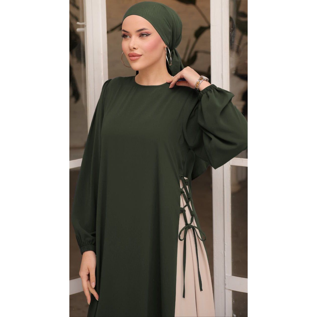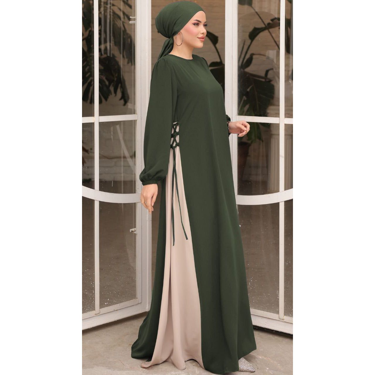 • Design: Straight-cut abaya with elegant contrast panel and side-tie feature